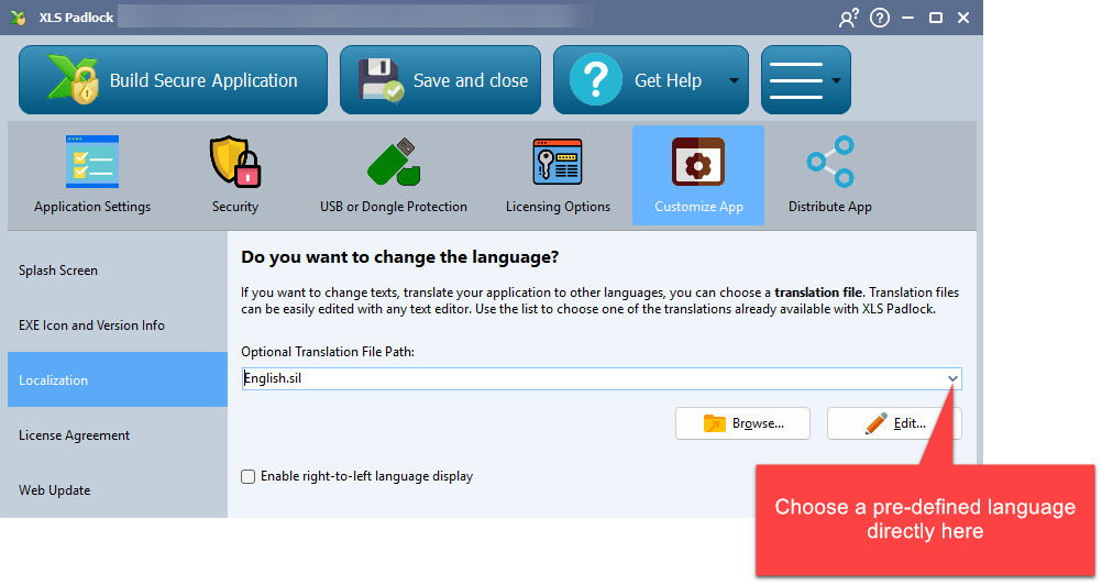 The selected translation file must be accessible at its specified path when you compile your application. XLS Padlock reads this file during the build process.
