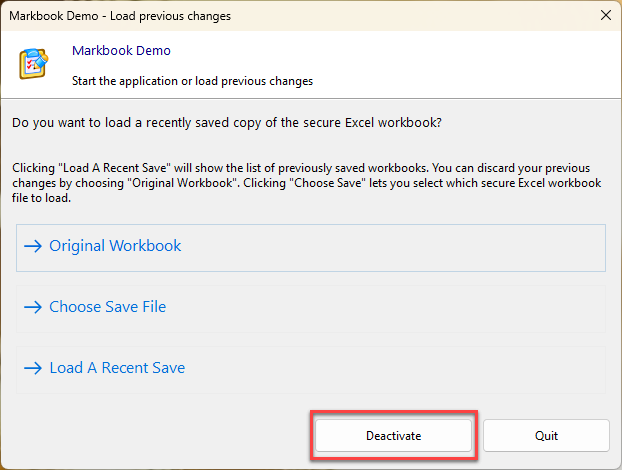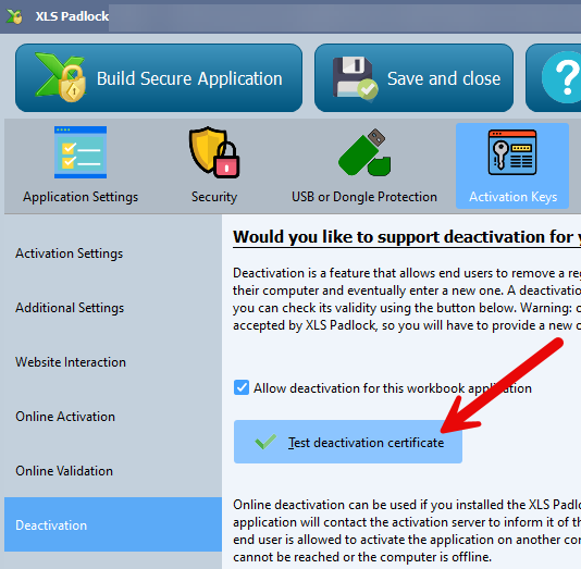 Deactivation generates a certificate that the end user must send to you. Using the Test Deactivation Certificate feature in XLS Padlock, you can verify the certificate’s authenticity. It is crucial to note that once an application is deactivated, its activation key is invalidated. You will need to issue a new key to the user for any future activations.