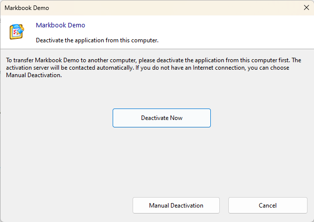 Even if the button is hidden, the application will automatically offer manual deactivation if the online process fails (e.g., if the deactivation server is inaccessible or the user is offline).