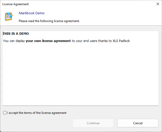 You can require users to accept an End User License Agreement (EULA) before they can open your protected workbook.