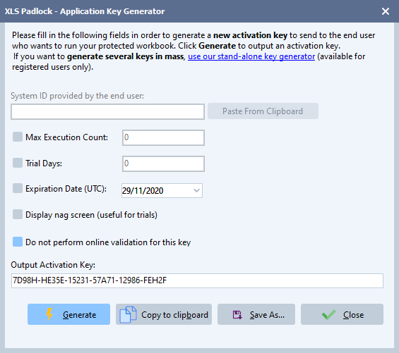 For hardware-locked keys, enter the System ID provided by your user and then click Generate. The resulting key will be tied to that specific computer.