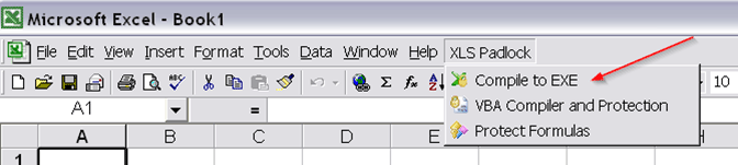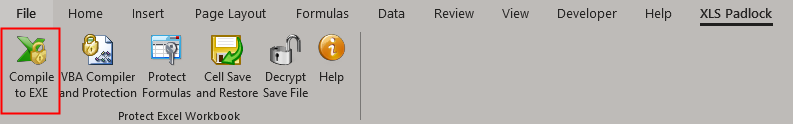 To start the Excel compiler, choose Compile to EXE in the XLS Padlock menu or ribbon: